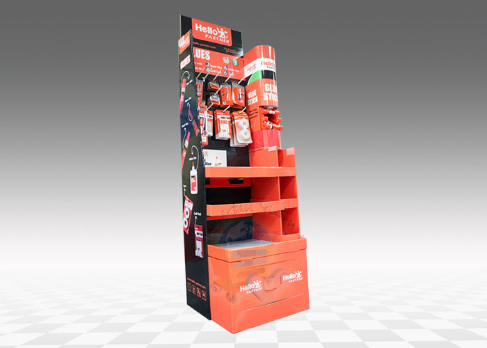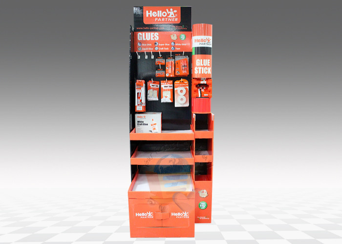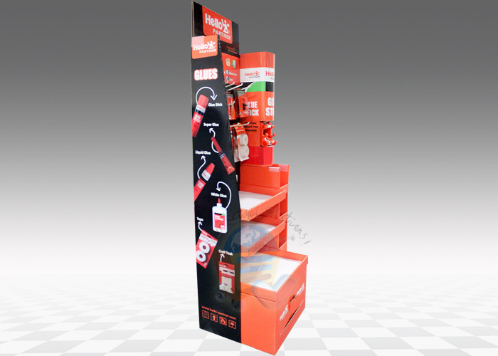 This 3-shelf cardboard floor hooks display is designed for glue products promotion.Customized size,logo and printing artwork according to your products and requirements,which can make the stand more outstanding and suatable for your glue's size to make better sale.There are some storage on the left side can put your brochure and catalogue.High quality corrugated material,each tier can hold around 15kg weight products,or we can add iron support under each tier if your goods is very heavy.Of course,if you don't like this style,tell us pls,we'll adjust it for you.