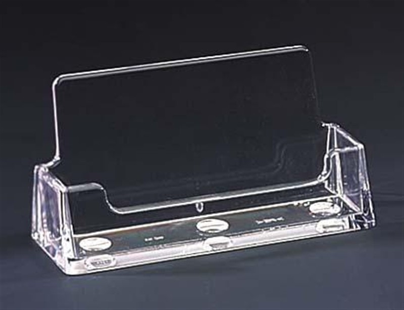 The double-sided sign holder with attached business card holder is a great tabletop display for advertising information and contact information. Placing literature in a double foot stand up sign holder draws the attention of viewers to read the advertised information. The attached business card holder (3.75"W x 1"H x 0.8125"D) provides space for easy distribution of contact information. The frame’s bottom load design allows for easy insertion of printed material. Constructed of clear acrylic that allows for easy viewing. Quantity discount pricing available.